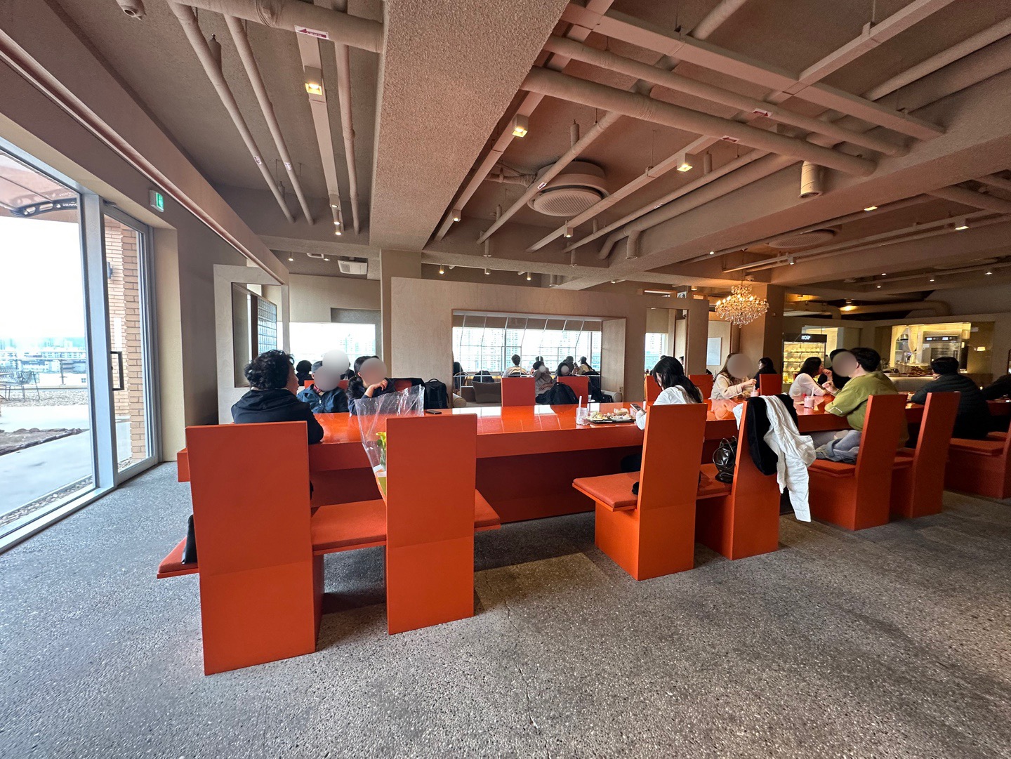 초대형 카페는 아니지만, 실내는 수십 명을 수용할 수 있을 만큼 넉넉한 규모를 갖추고 있습니다.🏡 특히 가운데 위치한 주황색 테이블은 아주 널찍하여 여러 명이 함께 앉기에 충분한 공간이었어요. 서로 모르는 사람들끼리 마주 보고 앉아도 크게 불편하지 않을 정도로 적당한 거리감이 있었습니다. 자리가 없다면 눈치 보지 말고 편하게 이 자리를 이용하셔도 좋을 것 같아요!😊☕